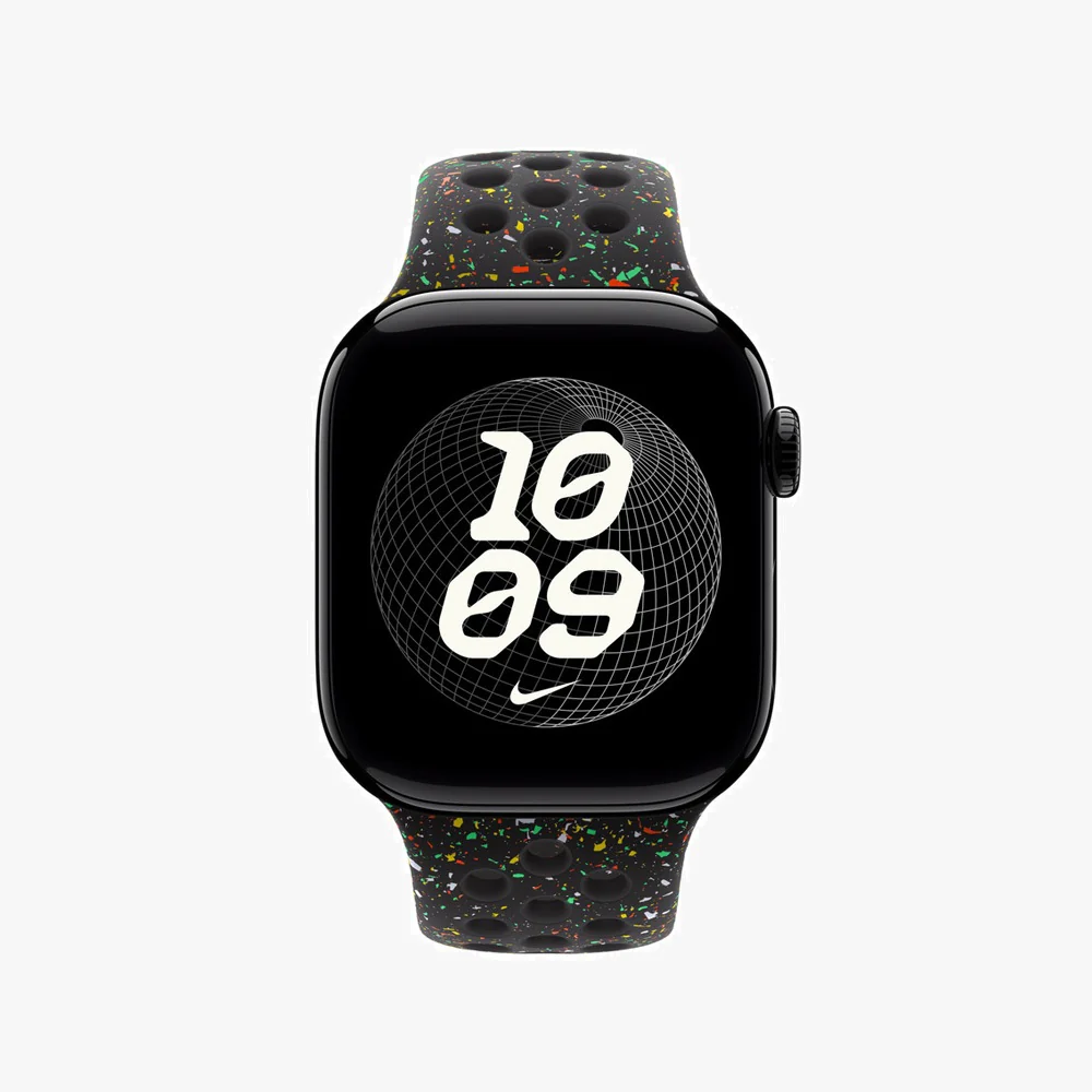 Made with compression-molded perforations for breathability, the Nike Sport Band is durable and strong, yet surprisingly soft. It features colorful flakes that create a randomized pattern, making each band completely unique. The smooth, dense material drapes elegantly across your wrist and feels comfortable next to your skin. An aluminum pin-and-tuck closure — carefully etched with the Run Swoosh logo — gives the pin a fresh matte finish.